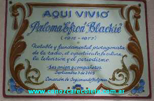 Aquí vivió Paloma Efron, Blackie, notable e imprescindible protagonista de la radio, la televisión, el espectáculo y el periodismo, dice la placa que será descubierta a las 18 horas, en un acto en el cual hablarán, entre otros, Ariel Ramírez, Ezequiel Koremblit, Enrique Mancini, China Zorrilla y Ricardo Horvath.