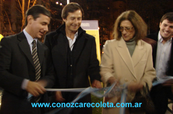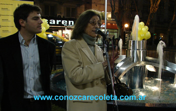 Tras una suspensión días antes, por cuestiones climáticas, en el frío atardecer del martes 21 de junio se inauguró la plazoleta ubicada en el triángulo que está frente al sanatorio, en Avenida Pueyrredón y Peña, donde termina la calle Anchorena. El lugar estaba bien iluminado, con gran cantidad de globos amarillos y la fuente emanando sus chorros de agua que dibujaban el espacio al contrastar con las luces de los faroles.