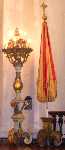 Dicha sombrilla también se hace presente a la derecha de la mesa del altar, a franjas rojas y amarillas.