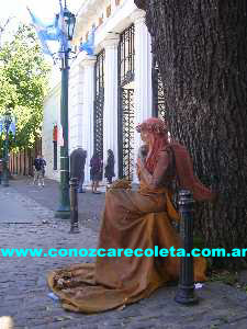 Puerta de ingreso al Cementerio de Recoleta, donde se aprecia una estatua viviente.
